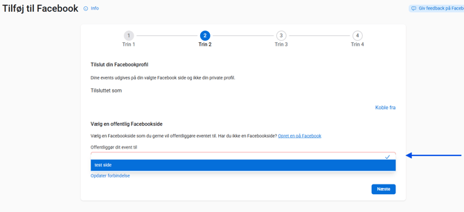 Under “Vælg en offentlig Facebookside” vælger du den Facebook-side, hvor dit event skal vises.
