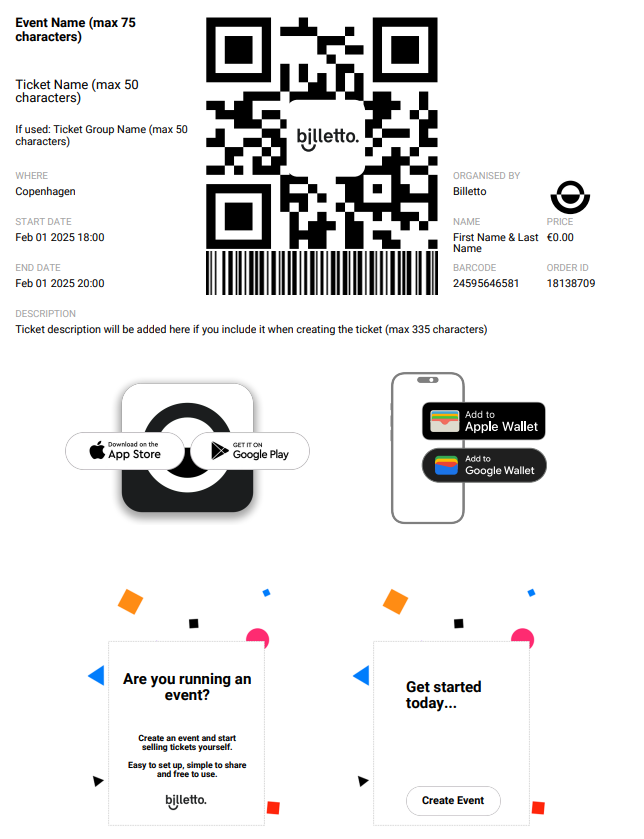 Below is an example of our ticket in a PDF format, which shows the two default images - 1 Billetto advertisement and one folding instruction.