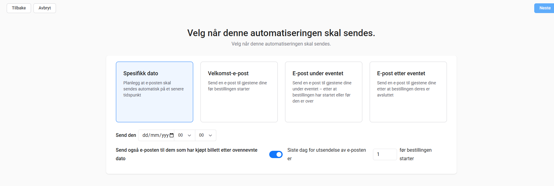 Når du velger Planlegg e-post, setter du opp en e-postautomatisering, og du må velge når den skal sendes til gjestene dine.